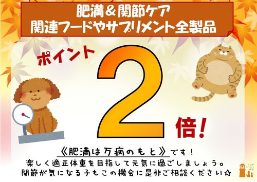 11月から12月は《肥満&関節ケアキャンペーン》!! 関連フードやサプリメントがポイント2倍です! 突然ですが、お家のわんちゃんねこちゃんは上から見てくびれがありますか?? 体に触ってみて ・背骨やあばら骨がなかなか触れない ・全然骨が分からない と…